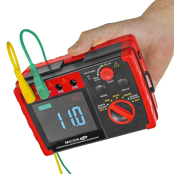 Цифровой прибор МЕГЕОН 13122 используется для определения сопротивления заземления по 2-проводной или 3-проводной схеме. Для дополнительной безопасности изделие оснащено измерителем напряжения земли (шаговое напряжение). Применяется специалистами для диагностики, технического обслуживания и ремонта различных заземляющих систем, электроустановок, распределительных устройств и УЗИП, а также другого электрического оборудования. Диапазоны измерений выбираются вручную. Предусмотрено удержание текущих показаний на дисплее. Модель имеет встроенное хранилище на 20 результатов.
