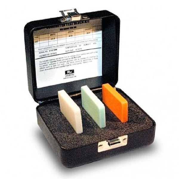 Комплект мер твёрдости представляет собой набор тестовых образцов из резины и пластмасс для воспроизведения ряда значений твёрдости в единицах Шора тип D по ГОСТ 24621-91 (ISO 868-85) и  ГОСТ Р ИСО 7619-1-2009 – комплект из 3 шт. образцов.