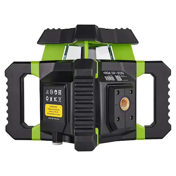 Для недопущения повреждения лазерной головки в процессе эксплуатации ротационный нивелир RGK SP-312G снабжен верхней крышкой, усиленной ребрами жесткости. 4 крупноразмерные ручки, позволяющие удобно переносить и устанавливать прибор, выполняют роль дополнительной защиты от механических воздействий. Благодаря параллельной конструкции они могут применяться как опора при использовании изделия для проецирования вертикальной плоскости, с установкой на грунт или любую поверхность. Также предусмотрена возможность крепления изделия на штативе, для чего на корпусе имеются два перпендикулярных винтовых крепления.