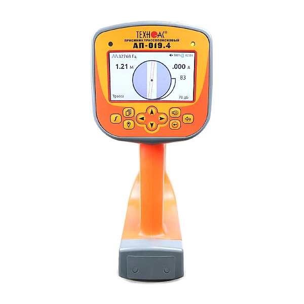 Морозоустойчивый трассопоисковый приемник в виде моноблока с отображением на графическом цветном ЖК дисплее линии положения коммуникации, графиков и шкал изменения уровней входных сигналов, цифровых значений уровней сигнала, расстояния до оси коммуникации, величины протекающего по ней тока и других параметров с диапазоном температуры эксплуатации от -30 до +50°С.
