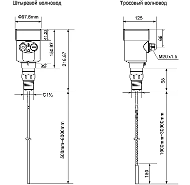Волноводные уровнемеры могут комплектоваться штыревым волноводом для измерения в диапазоне от 0,5 до 6 метров или тросовым волноводом для диапазона измерений от 1 до 30 м.